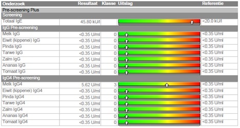 - 7 veelvoorkomende allergenen (IgG & IgG4): ananas, melk, tarwe, zalm, kippeneiwit, pinda, tomaat