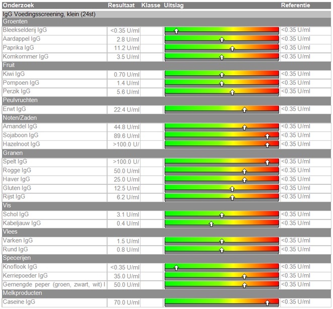 - Op basis van de pre-screening: 24 voedingsmiddelen via IgG4 of IgG totaal