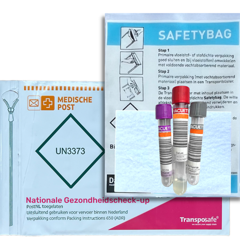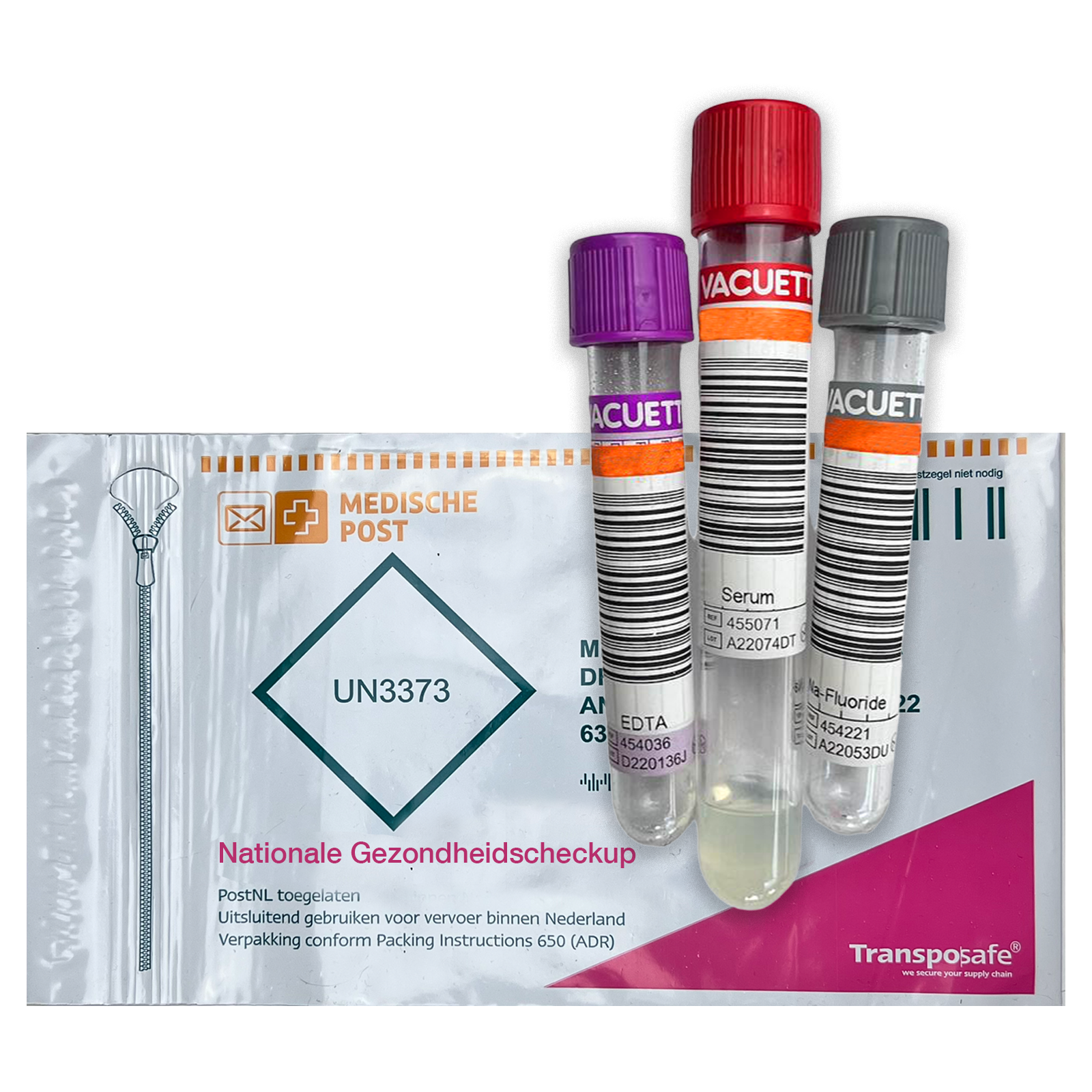 Tijdens dezelfde afspraak wordt bloed afgenomen voor een breed gezondheidsprofiel. De analyse wordt uitgevoerd door een gecertificeerd laboratorium.