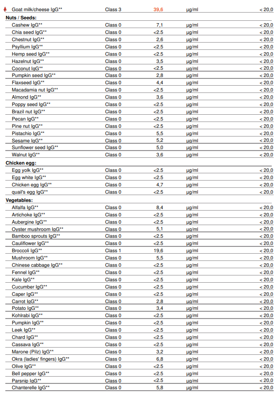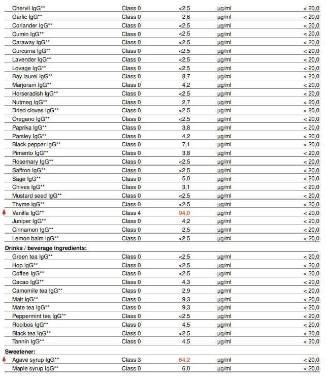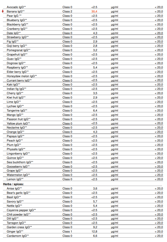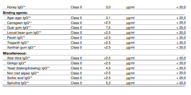 - Resultaten per voedingsmiddel in klassen (0 t/m 4), op basis van IgG-concentratie (µg/ml)