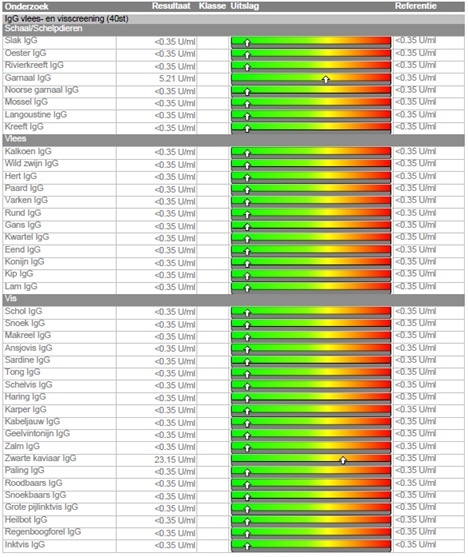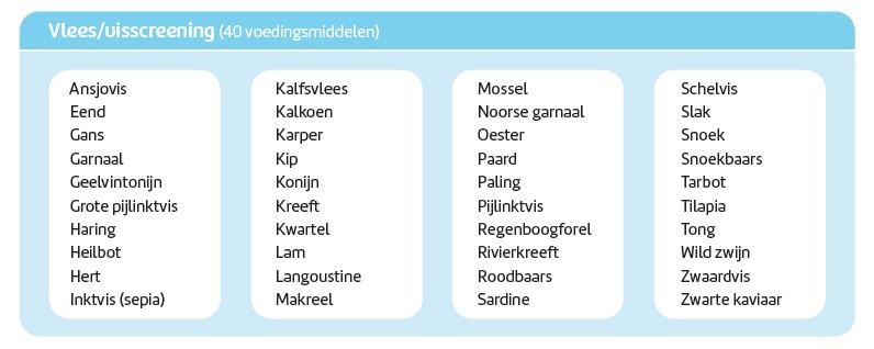 Met deze test wordt onderzocht of uw immuunsysteem allergisch reageert op 40 verschillende soorten vlees, vis, schaaldieren en weekdieren. Er is geen overlap met de pre-screening; deze test onderzoekt dus aanvullende voedingsmiddelen.