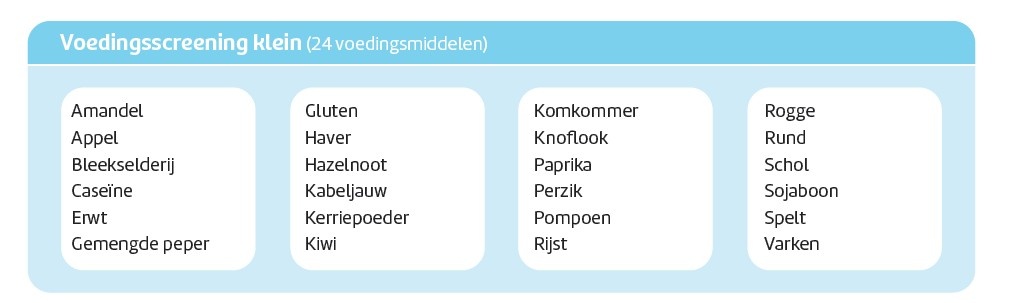 De voedingsscreening klein is een gerichte vervolgtest die de reactie van je immuunsysteem op 24 veelvoorkomende voedingsmiddelen in kaart brengt. Deze test is bedoeld voor mensen die vermoeden dat bepaalde voedingsmiddelen bijdragen aan hun gezondheidsklachten, zoals vermoeidheid, huidproblemen, spijsverteringsklachten of vage lichamelijke ongemakken.